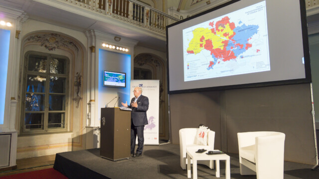 Wehrschütz lieferte im Anschluss einen Vergleich zwischen dem Balkan und der Ukraine, den er mit zahlreichen Grafiken und Fernsehbeiträgen illustrierte. Wie unterschiedlich und doch in einigen Bereichen ähnlich die Voraussetzungen der beiden Regionen sind, zeigte er anhand folgender Beispiele: „Der Balkan ist ein sehr heterogenes Gebiet, Montenegro hat etwa 700.000 Einwohner, Serbien sieben Millionen. Der Balkan war immer die kulturelle Wasserscheide Europas. Die Ukraine ist mit rund 44 Millionen Einwohnern doppelt so bevölkerungsreich wie der Balkan. Sie ist zwar großräumig, aber dennoch auch sehr heterogen.“ Beide Regionen streben in Richtung EU – doch führen die Nachwirkungen der Zerfallskriege im ehemaligen Jugoslawien dazu, „dass die Staaten des Balkans nie eine gemeinsame Linie in Richtung EU und NATO gefunden haben.“ Die Ukraine habe diese Problemlage nach außen nicht, hier gäbe es einen klaren Zug in Richtung Westen. „Das Land kämpft aber mit enormen sozialen Unterschieden, Reformen sind ungeheuer schwierig“, so der Experte. Für ihn ist der Balkan der „weiche Unterleib Europas“, eine Region, die alleine nicht für Stabilität sorgen könne. „Deswegen müssen die EU und die NATO mithelfen, diese Region endgültig zu stabilisieren.“ Die Ukraine ist für Wehrschütz „das wichtigste Projekt seit dem Fall der Berliner Mauer und dem Zerfall der Sowjetunion. Sie ist das einzige Land der ehemaligen Sowjetunion, das sich um Demokratie bemüht – dabei müssen wir die Ukraine unterstützen.“